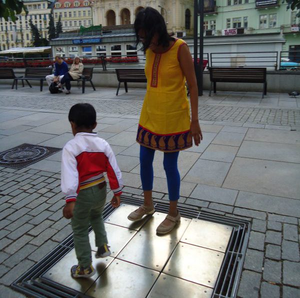 We had a picnic lunch and then walked back towards the Grand Hotel Pupp for coffee and hot chocolate. On the way the kids could romp around on a floor piano by Richter Spielgerate on the street.