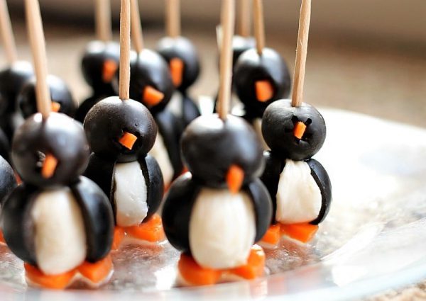 - Olive Penguins made of black olives, carrots, and mozzarella balls are the unique combination of funny-looking, easily preparing, and healthy snacks which hardly leave any child indifferent. To get the recipe, check out the source website.